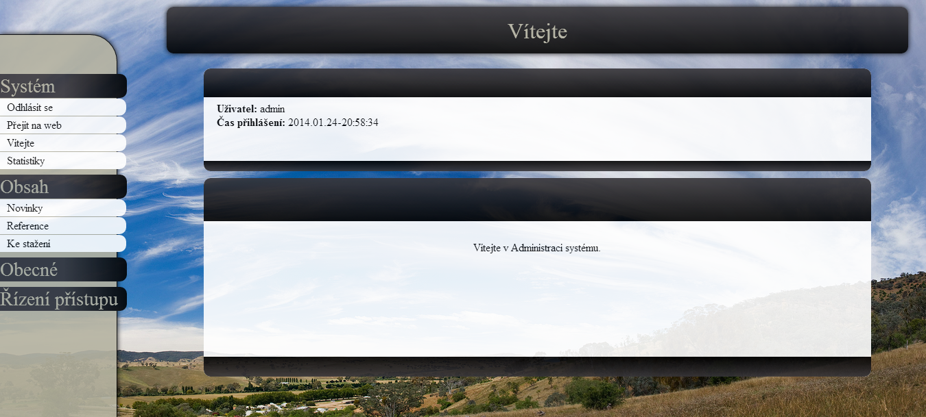 Základní vybavení systému je systémový modul, který umožňuje pohodlný přesun mezi administrací a webem, odhlášení z administrace a zobrazení úvodní obrazovky.
